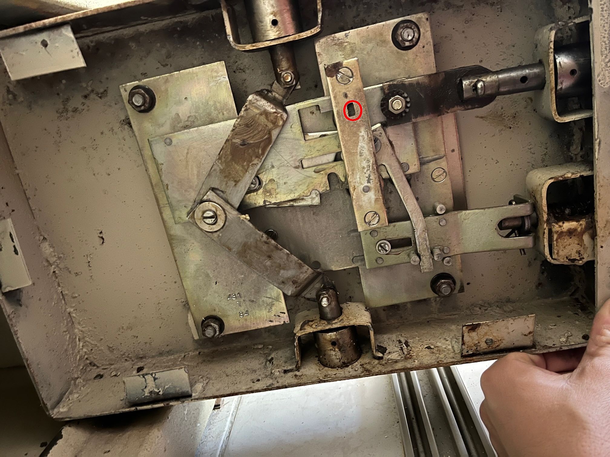le mentonnet de combinaison se trouve derrière le trou signalé par un cercle rouge en y introduisant un petit tournevis au dessus du mentonnet et en relevant le tournevis avec modération vous ferez descendre légèrement le mentonnet et en tournant les compteurs un par un vous devriez parvenir à trouver les chiffres de combinaison.